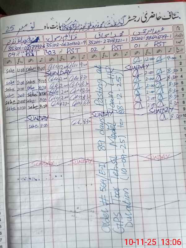| CNIC | Full Name | Designation | R/C | Absence During Last Calender Month |