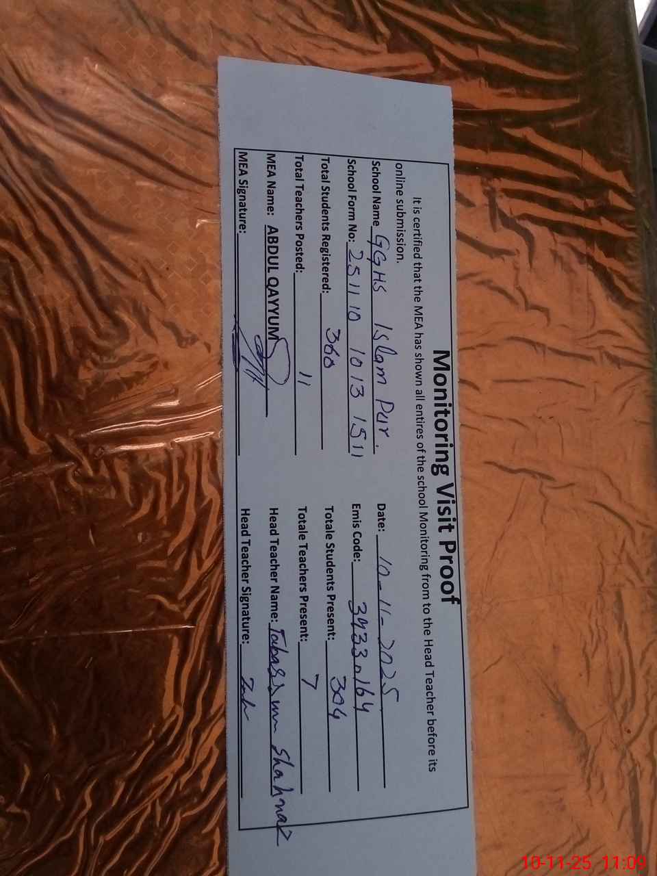 | EMIS Code: 39330164 | Name of School: GGHS ISLAM PUR | |||