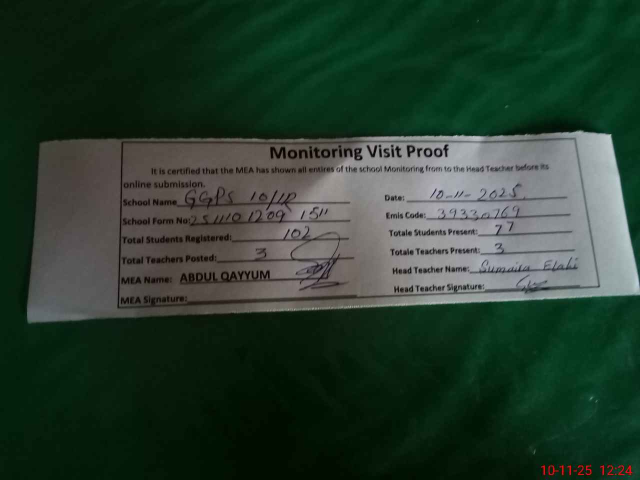 | Monitoring Date: 10-11-2025 | Start Time: 10-11-2025 12:09 PM | End Time: 10-11-2025 12:24 PM | Name of MEA: AB**** QA**** | |