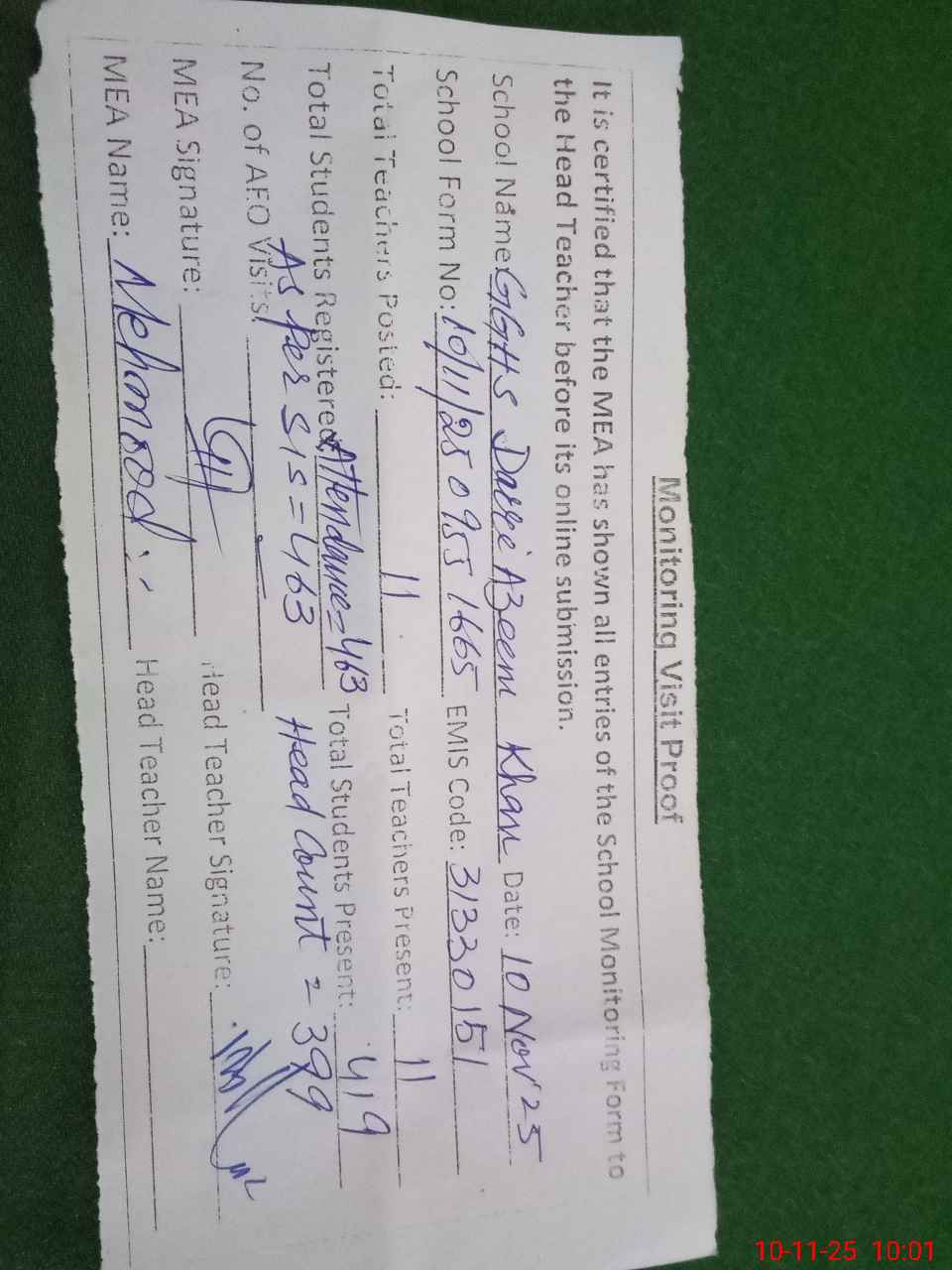 | Monitoring Date: 10-11-2025 | Start Time: 10-11-2025 09:23 AM | End Time: 10-11-2025 10:03 AM | Name of MEA: Ma**** UlHa**** | |