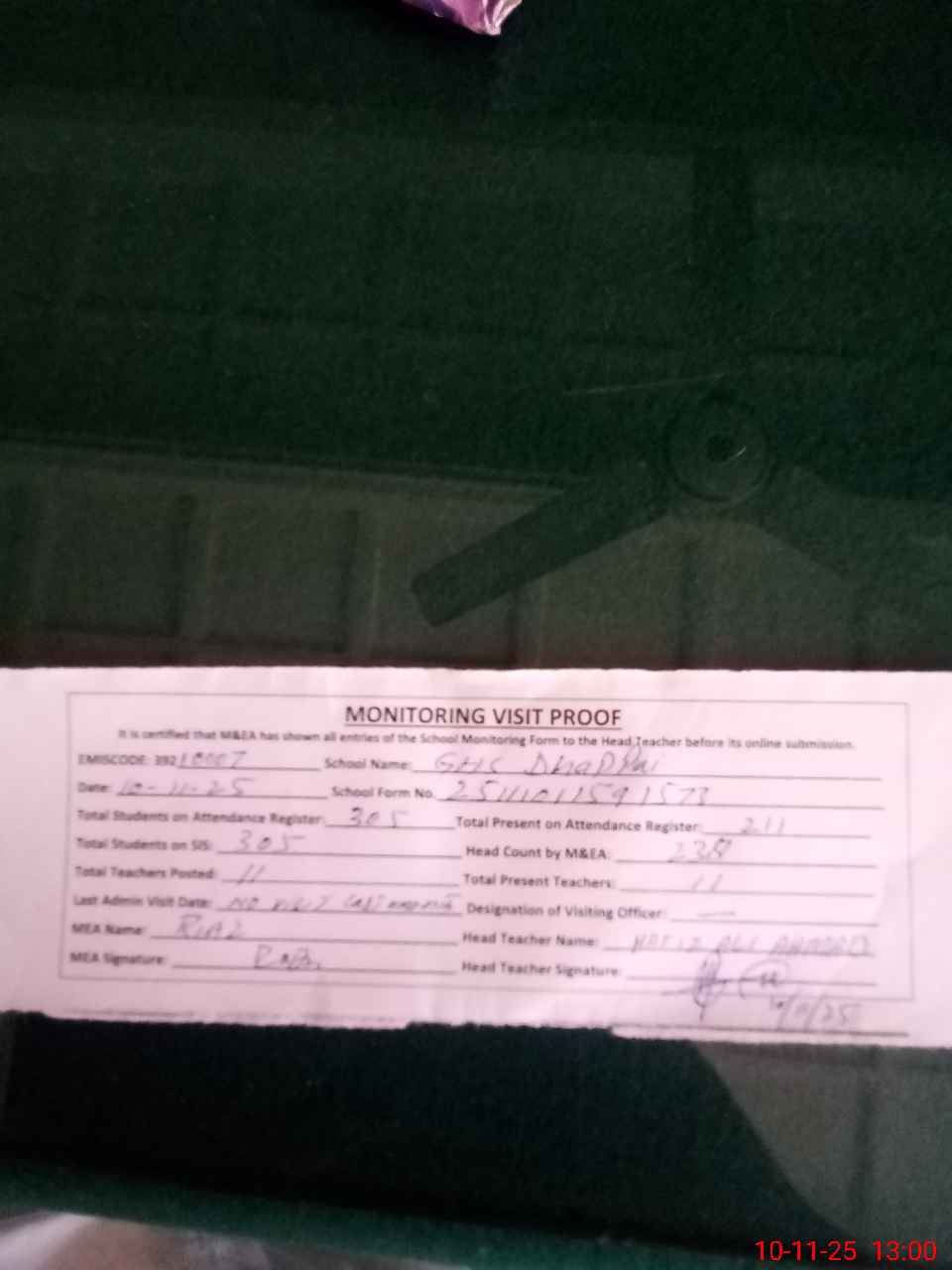 | Attendance Register | Head Teacher | MEA with School | Visit Proof |