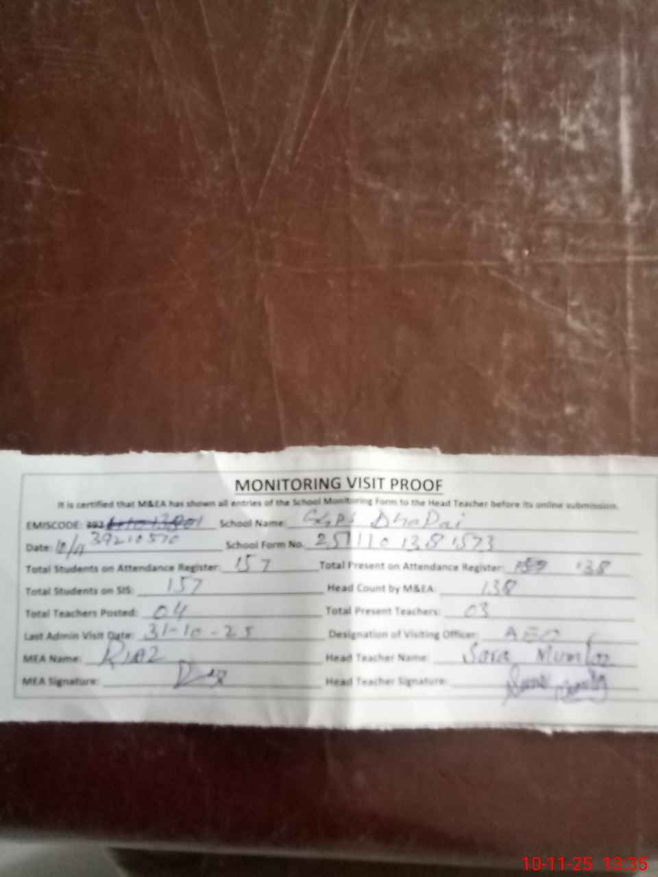 | Attendance Register | Head Teacher | MEA with School | Visit Proof |