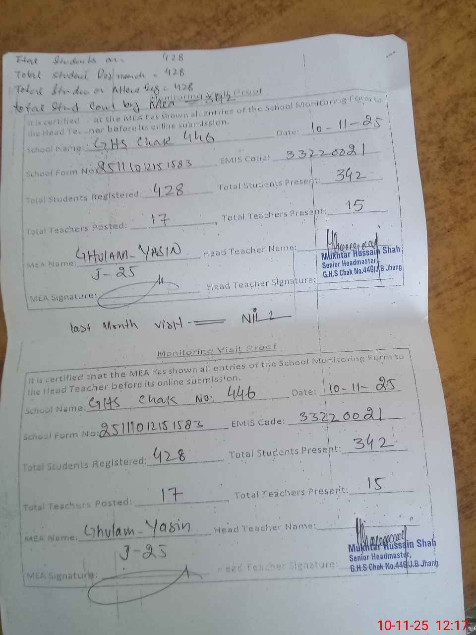 | Attendance Register | Head Teacher | MEA with School | Visit Proof |