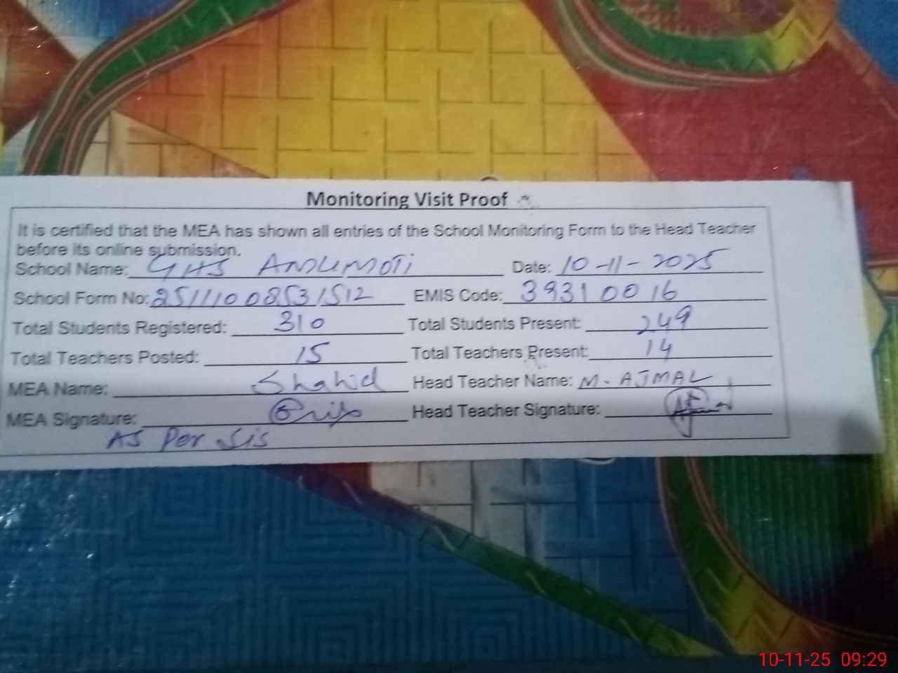 | Attendance Register | Head Teacher | MEA with School | Visit Proof |