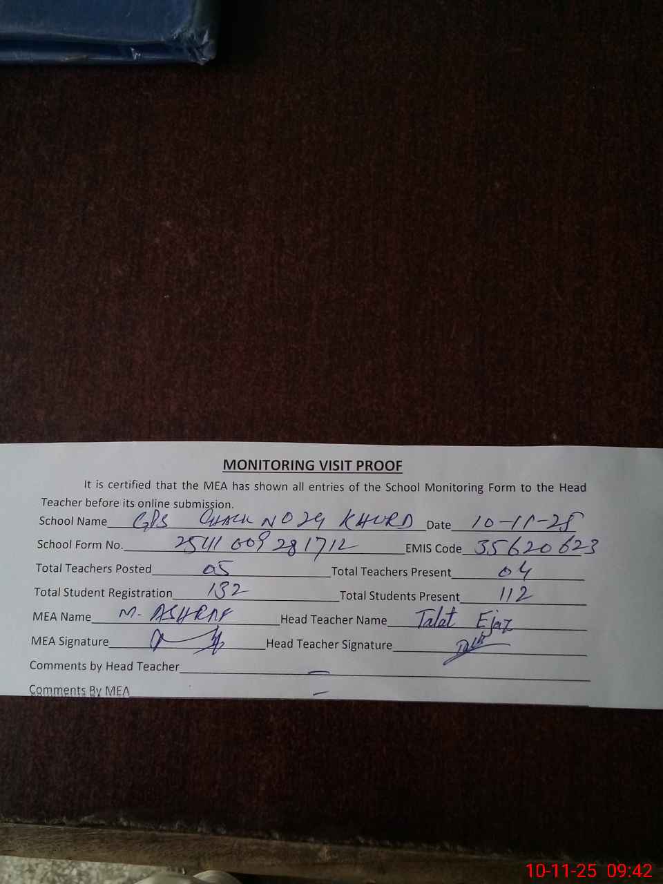 | Attendance Register | Head Teacher | MEA with School | Visit Proof |