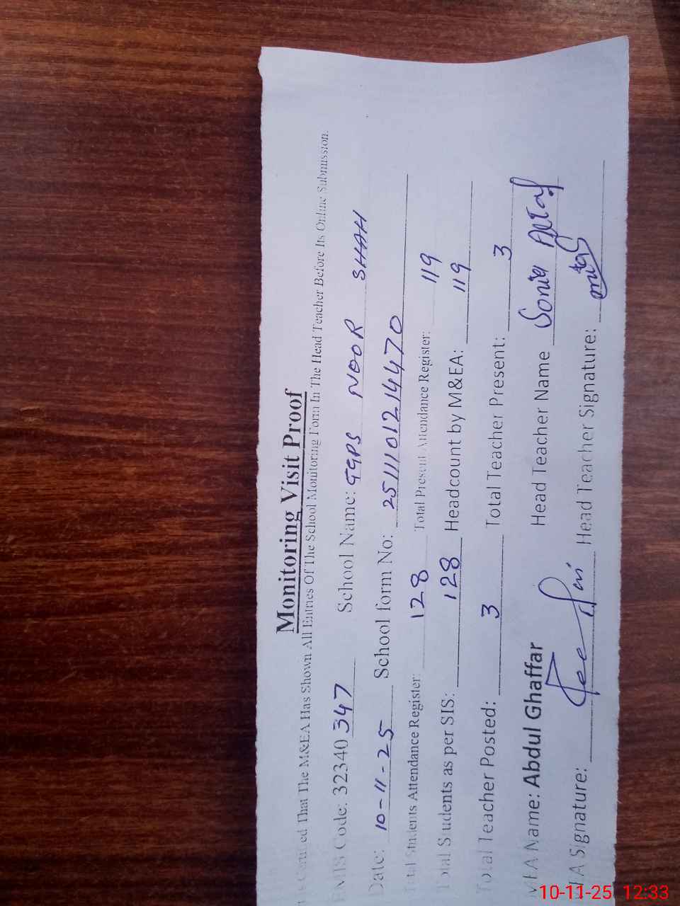 | Attendance Register | Head Teacher | MEA with School | Visit Proof |
