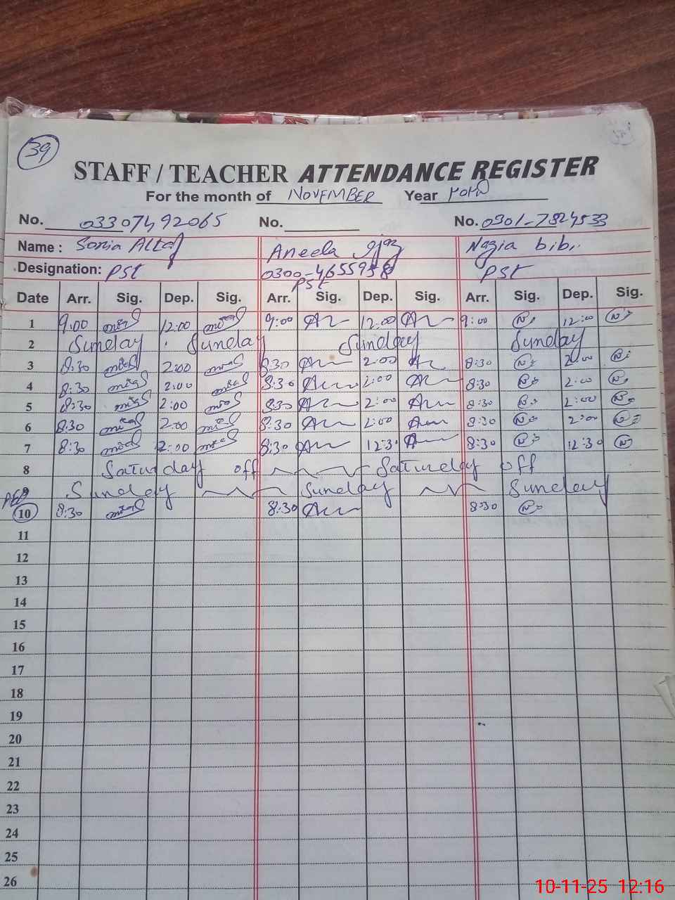 | CNIC | Full Name | Designation | R/C | Absence During Last Calender Month |