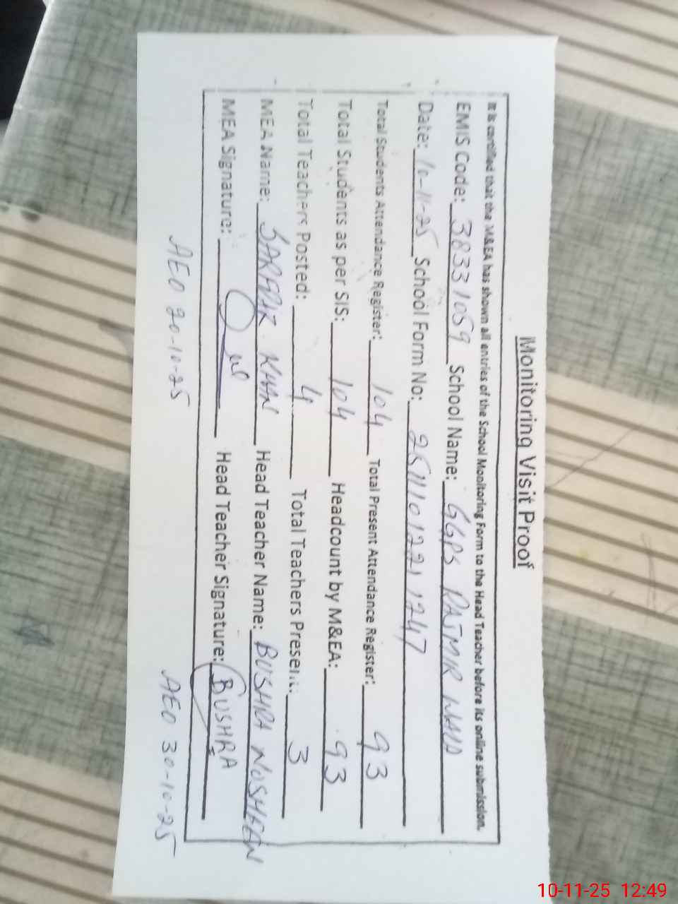 | Attendance Register | Head Teacher | MEA with School | Visit Proof |