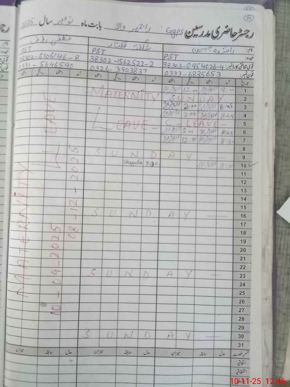 | CNIC | Full Name | Designation | R/C | Absence During Last Calender Month |