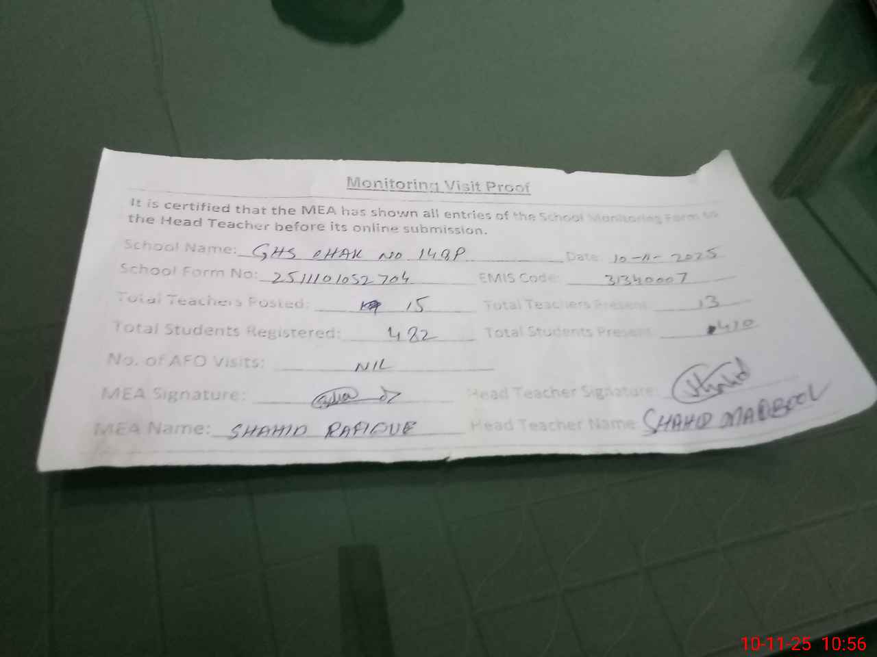 | Attendance Register | Head Teacher | MEA with School | Visit Proof |