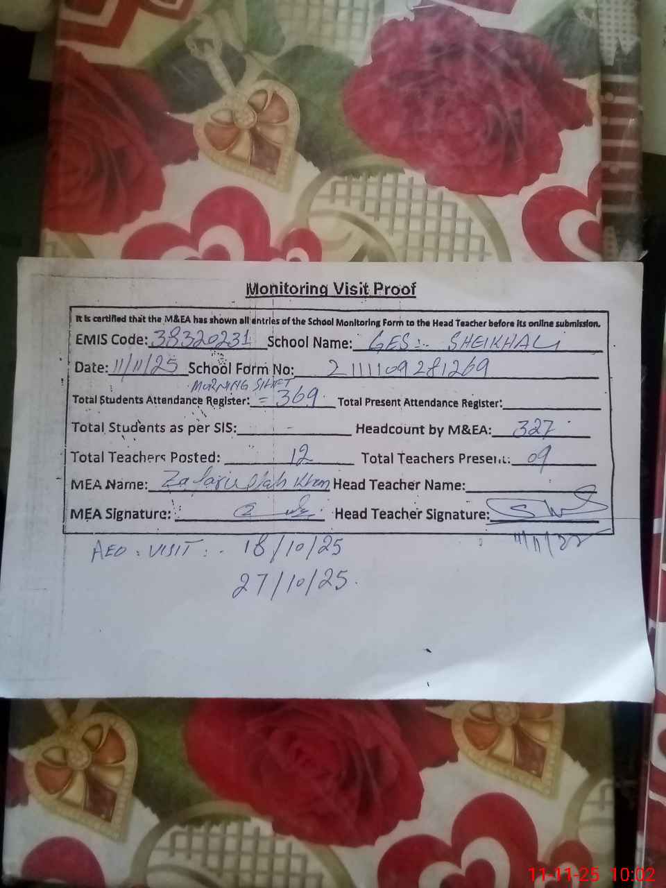 | Attendance Register | Head Teacher | MEA with School | Visit Proof |