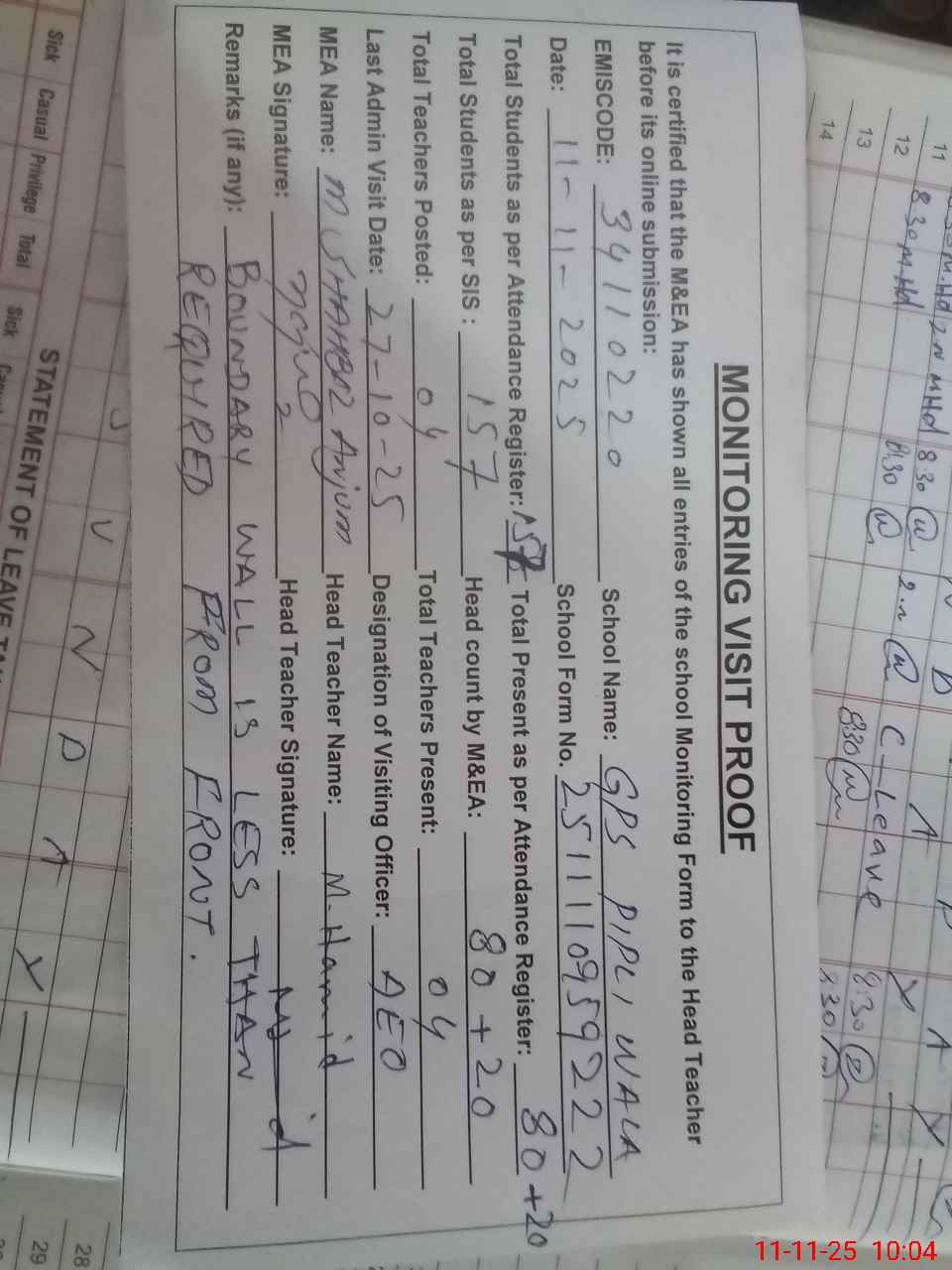| Attendance Register | Head Teacher | MEA with School | Visit Proof |