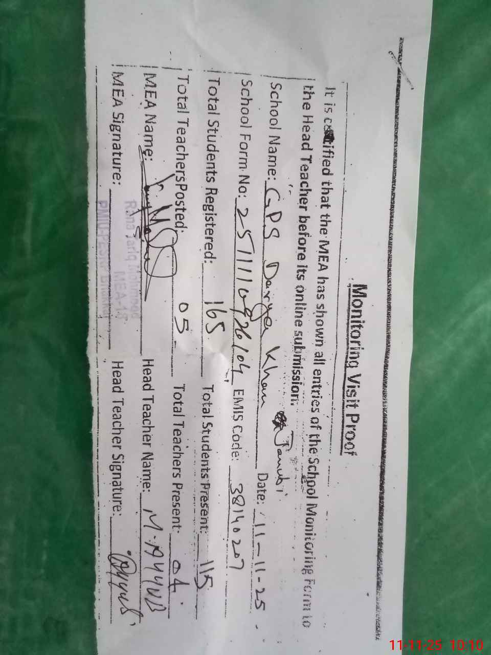 | Remarks (Use Separate Page if Required): Last visit of education authority 1 Designation AEO 2 Name Khalid Hanif 3 Date of visit 10 Nov 2025 | |||||