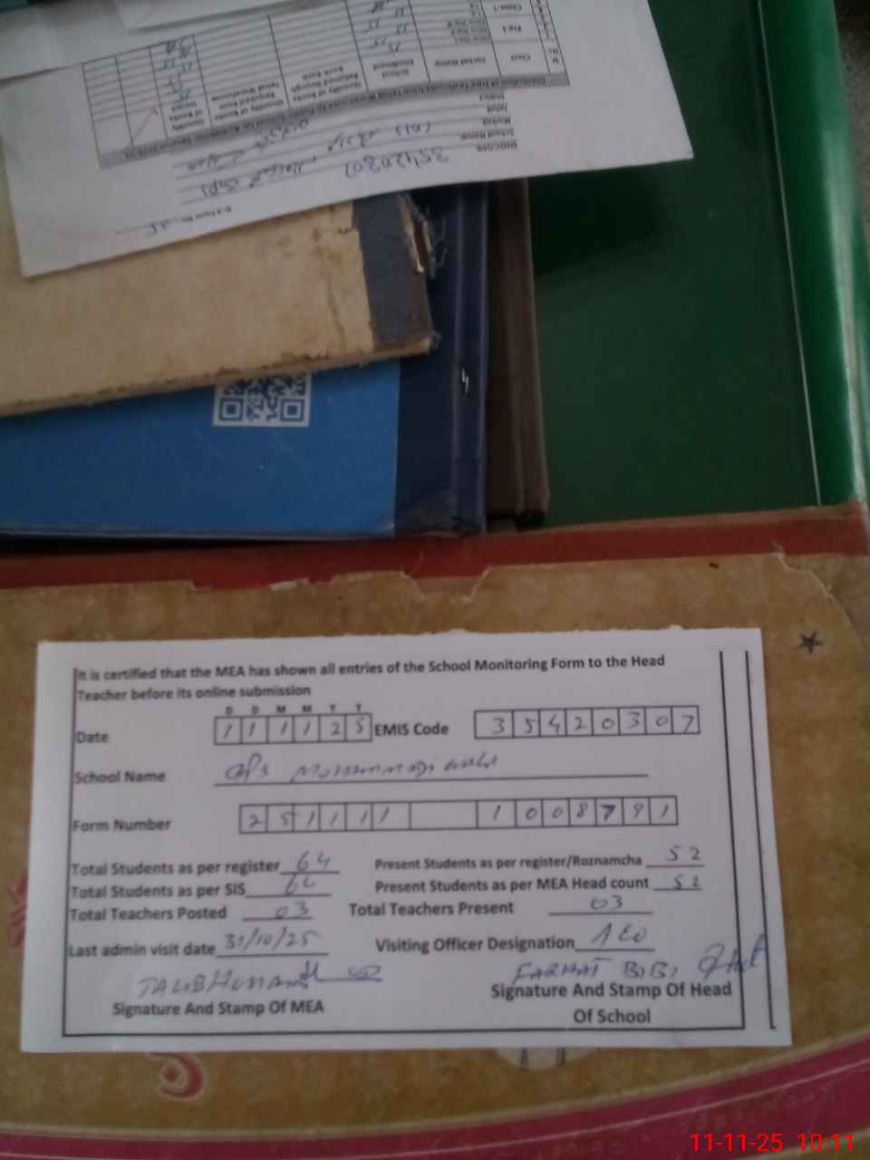 | Certified that this School was Inspected by the Undersigned MEA/DMO Today and the Information Stated Above is as Per Record. | |||||
