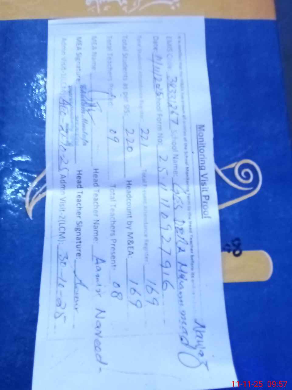 | Attendance Register | Head Teacher | MEA with School | Visit Proof |