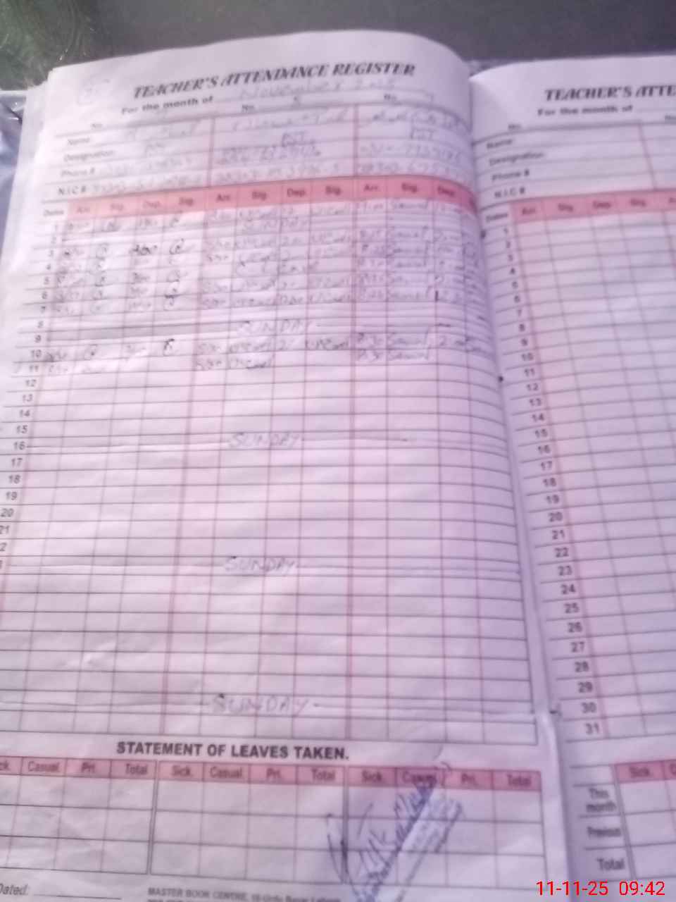 | CNIC | Full Name | Designation | R/C | Absence During Last Calender Month |
