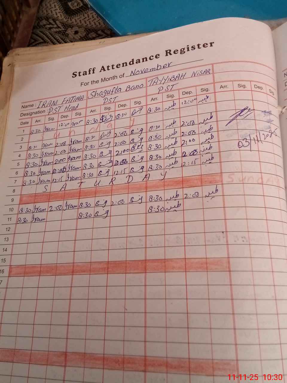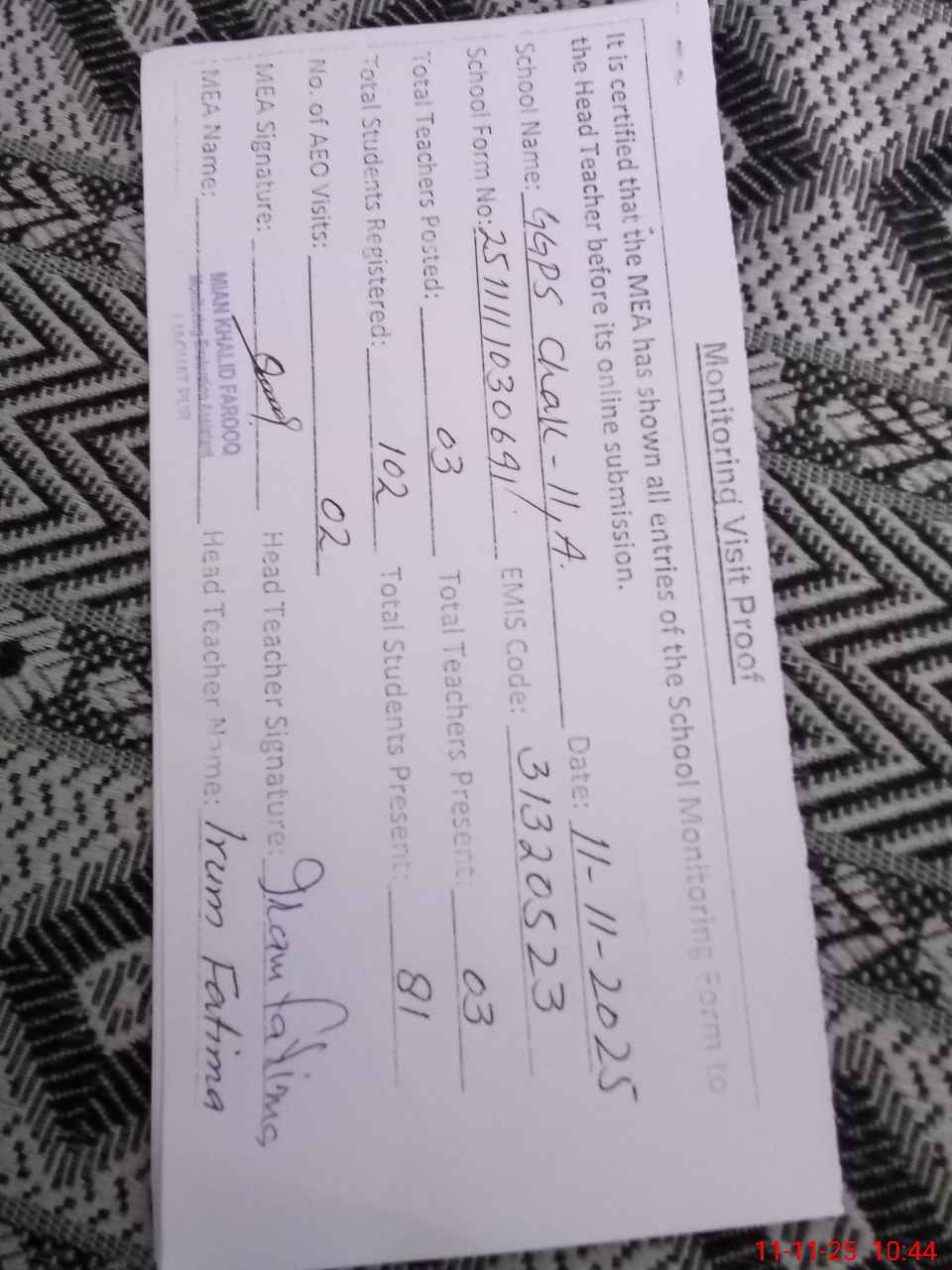 | Monitoring Date: 11-11-2025 | Start Time: 11-11-2025 09:53 AM | End Time: 11-11-2025 10:47 AM | Name of MEA: Kh**** Fa**** | |
