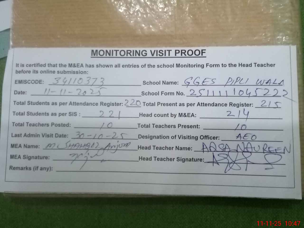 | Attendance Register | Head Teacher | MEA with School | Visit Proof |
