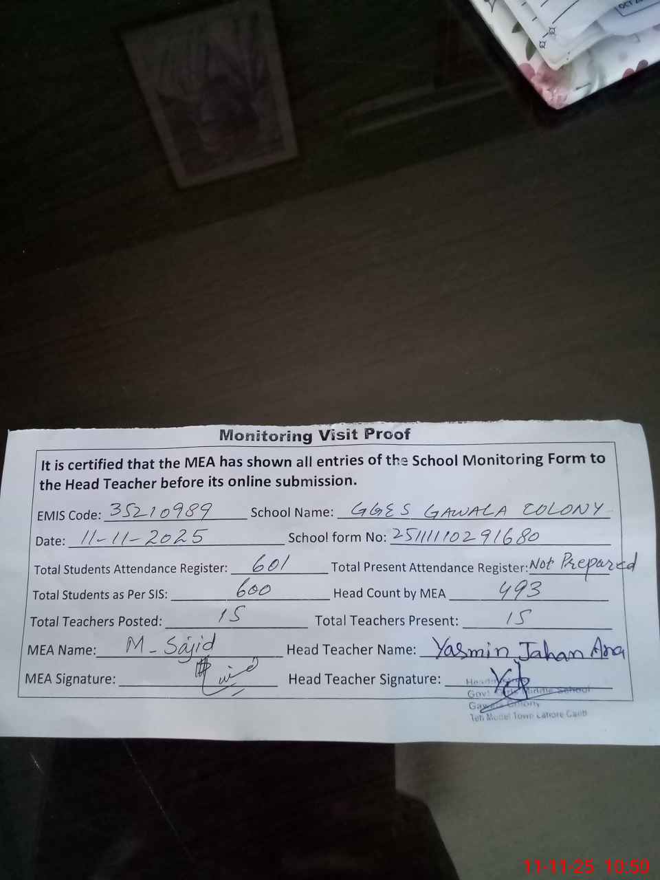 | Monitoring Date: 11-11-2025 | Start Time: 11-11-2025 09:35 AM | End Time: 11-11-2025 10:51 AM | Name of MEA: MU**** SA**** | |