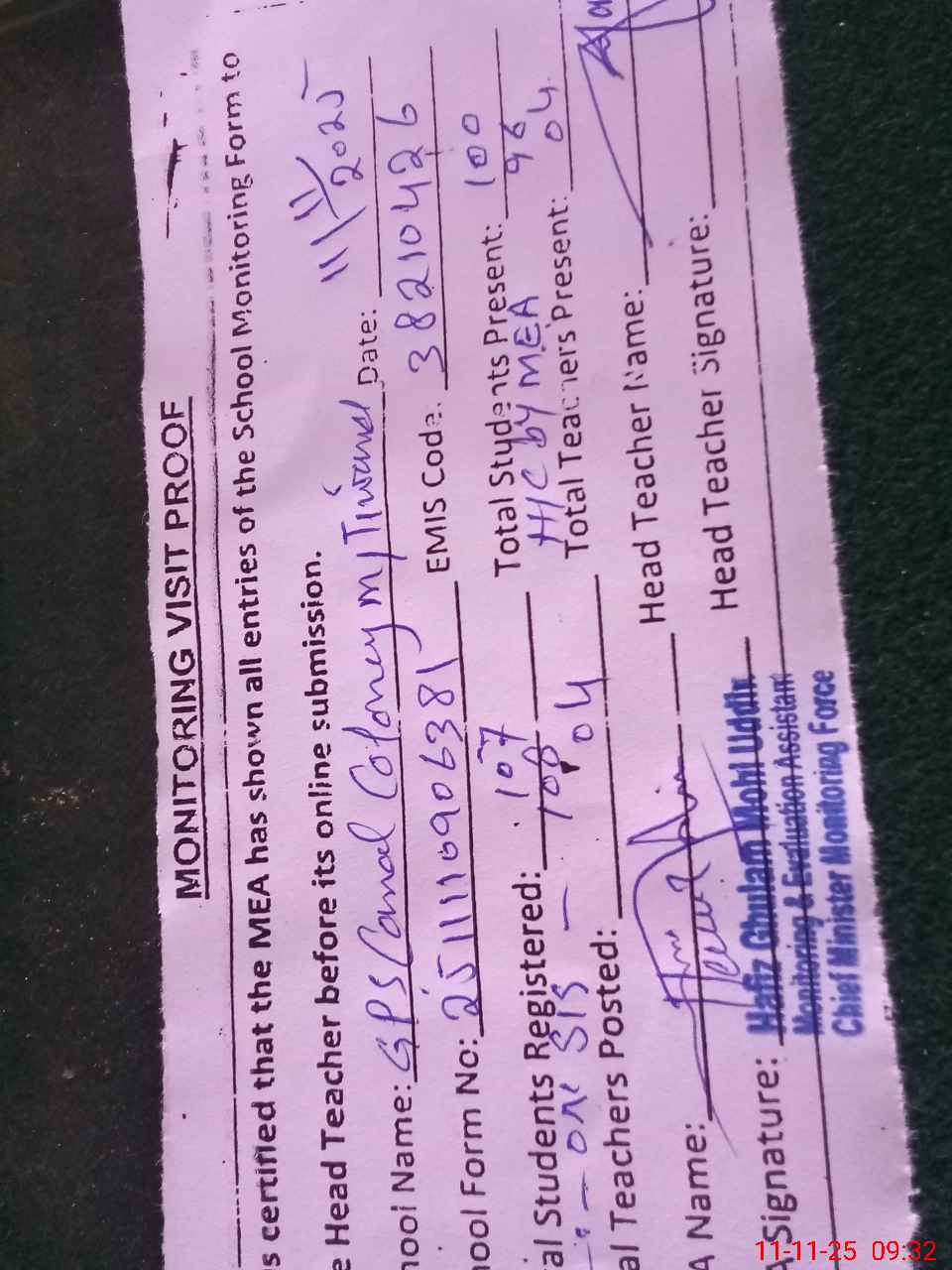 | EMIS Code: 38210426 | Name of School: GPS CANAL COLONY MITHA TIWANA | |||