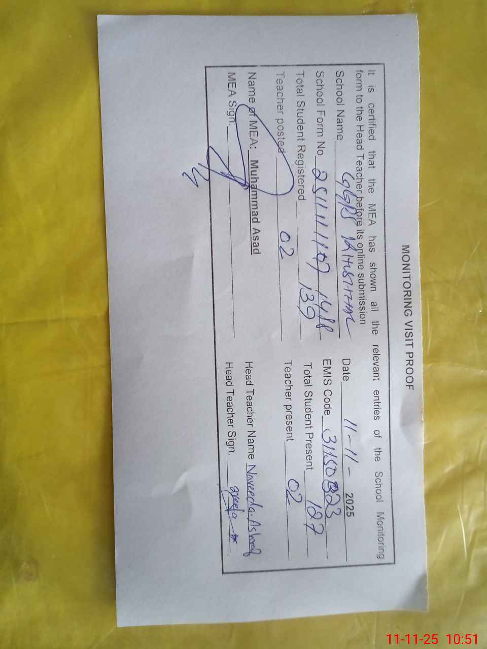 | Attendance Register | Head Teacher | MEA with School | Visit Proof |