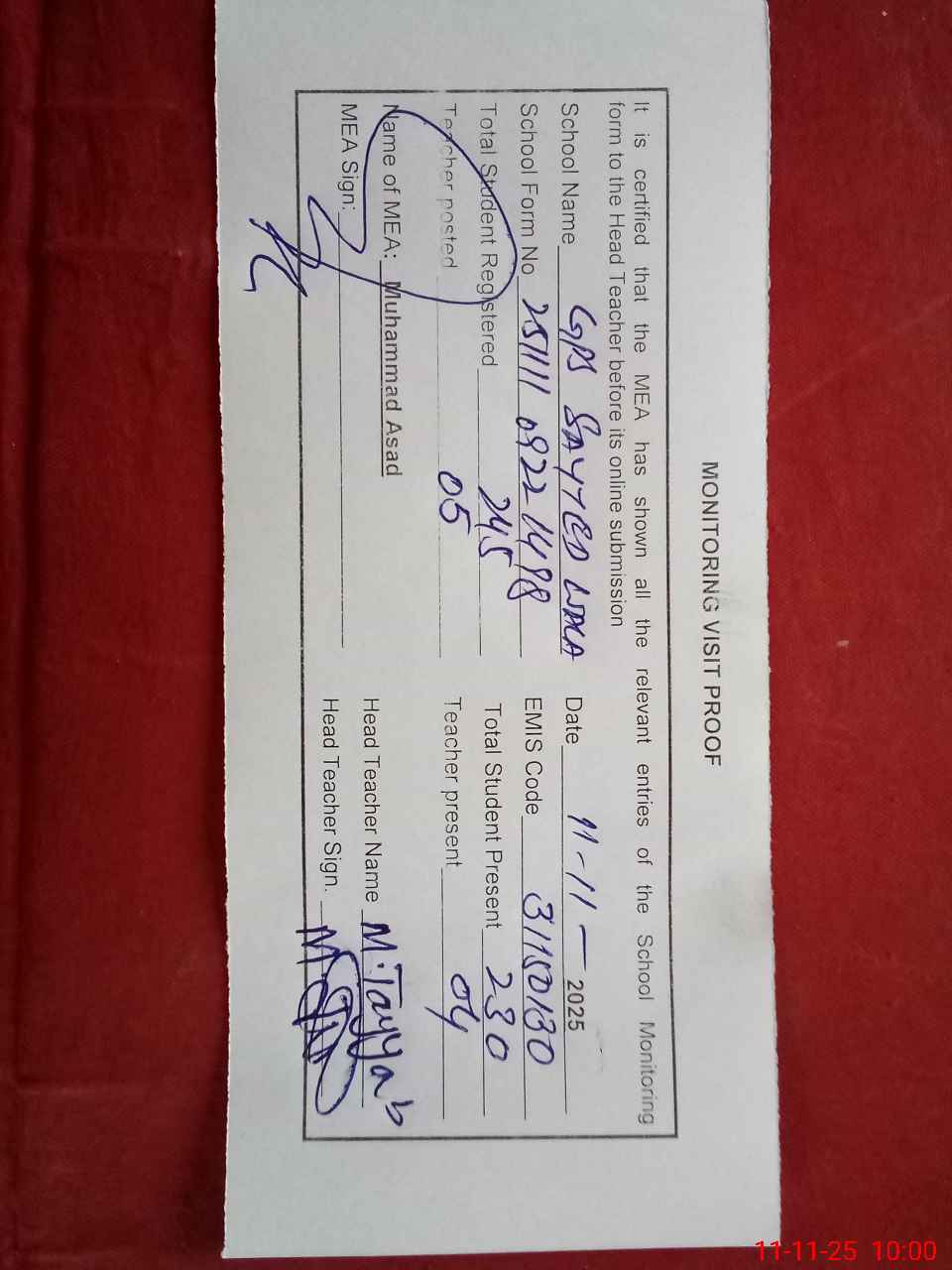 | EMIS Code: 31150180 | Name of School: GPS SAYED WALA | |||