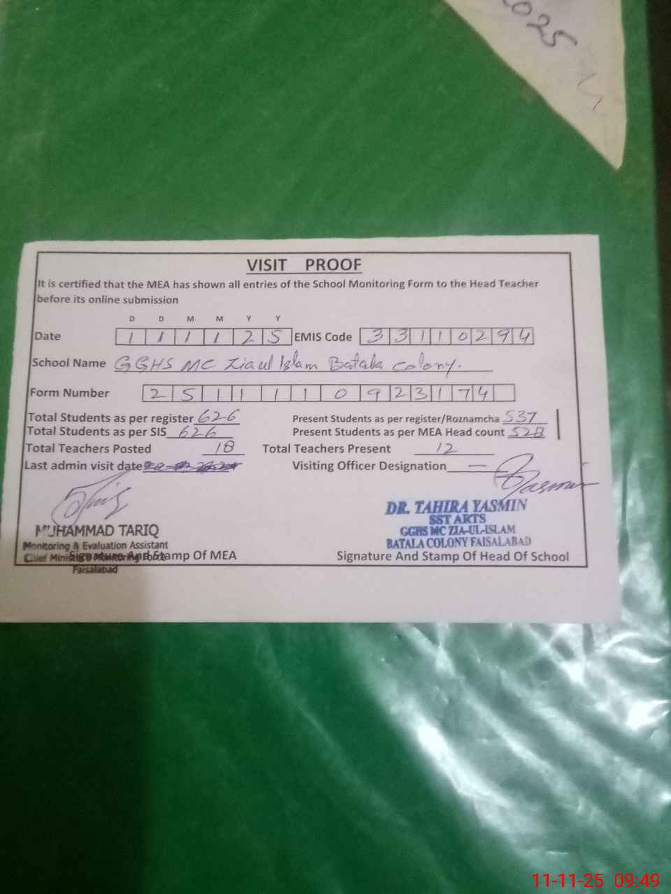 | Attendance Register | Head Teacher | MEA with School | Visit Proof |