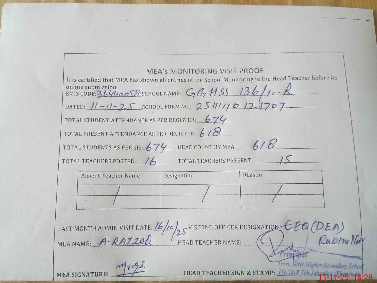 | Attendance Register | Head Teacher | MEA with School | Visit Proof |
