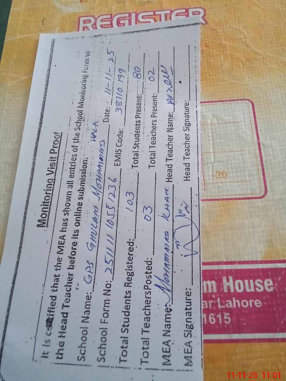 | Attendance Register | Head Teacher | MEA with School | Visit Proof |