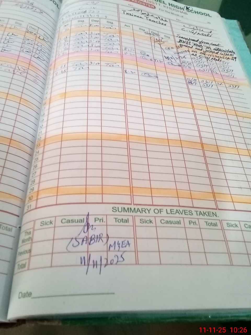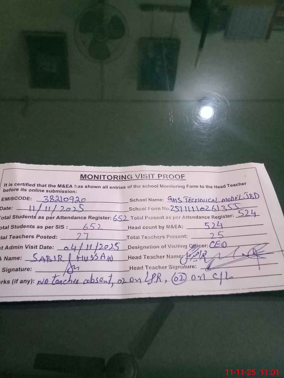 | Remarks (Use Separate Page if Required): No teacher absent 02 teacher on LPR 02 teacher on casual leave Last admin visit by CEO on 04 Nov 2025 | |||||