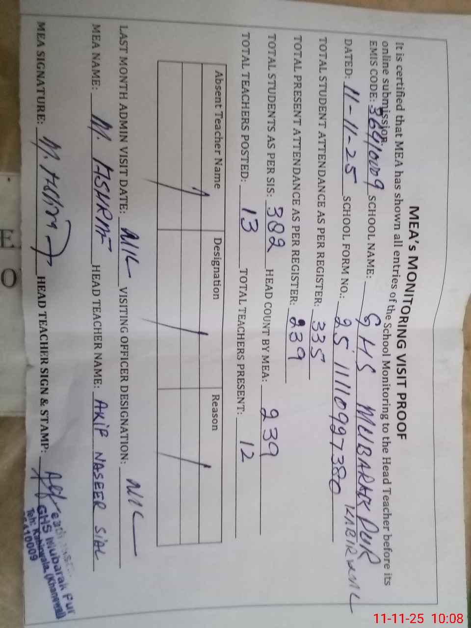 | Attendance Register | Head Teacher | MEA with School | Visit Proof |