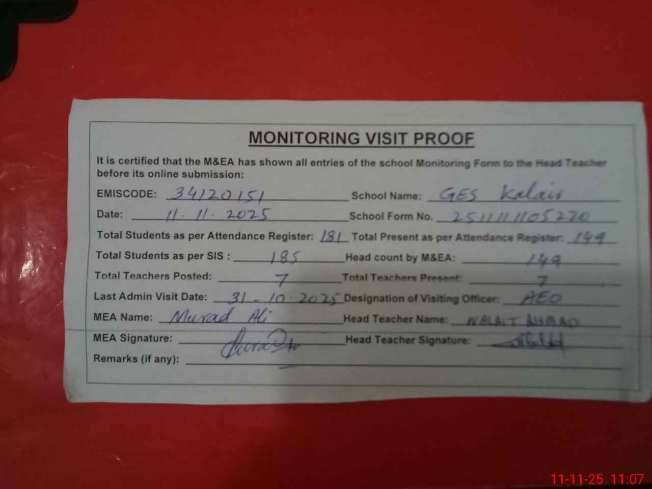 | Attendance Register | Head Teacher | MEA with School | Visit Proof |