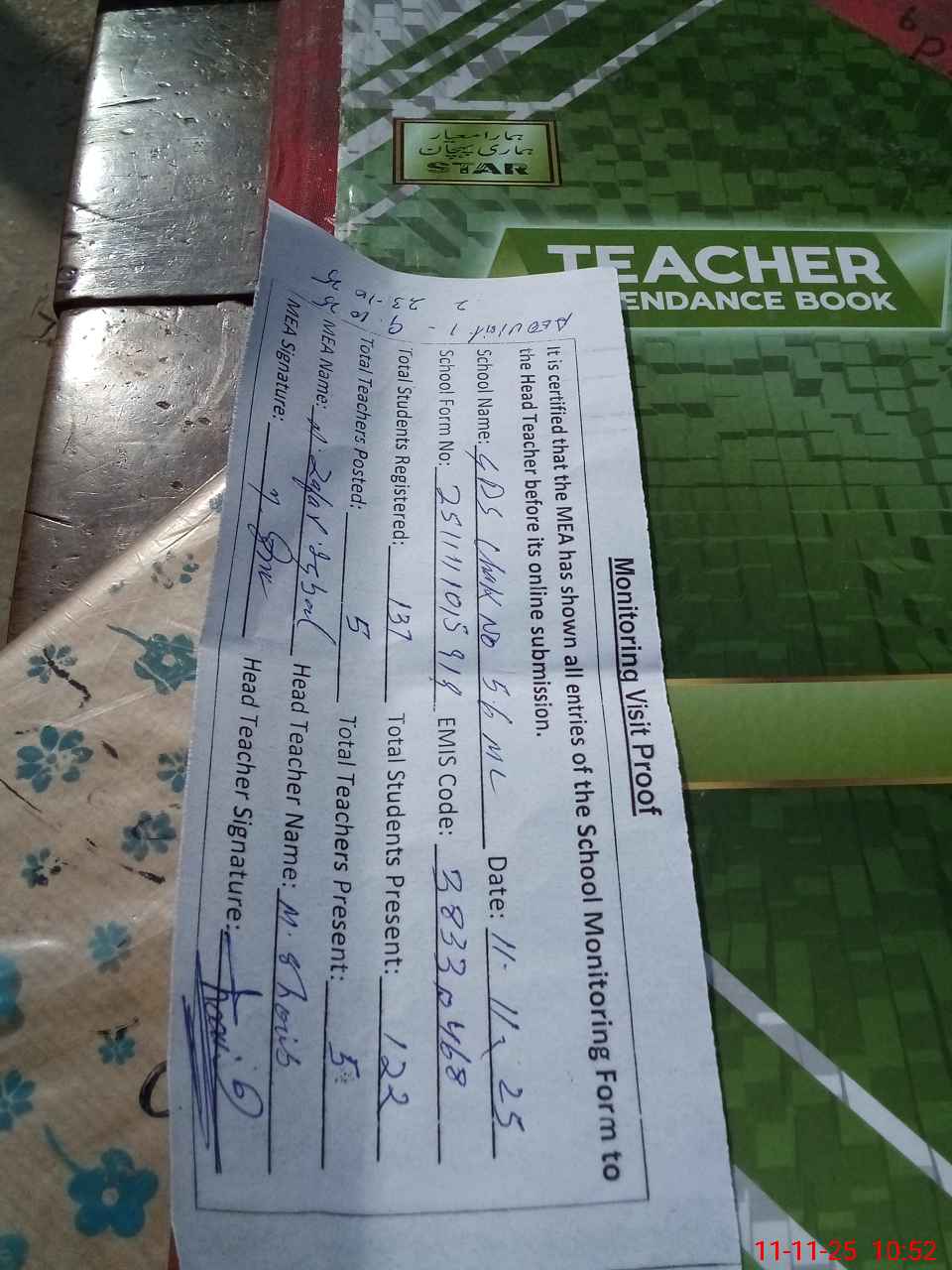 | Attendance Register | Head Teacher | MEA with School | Visit Proof |