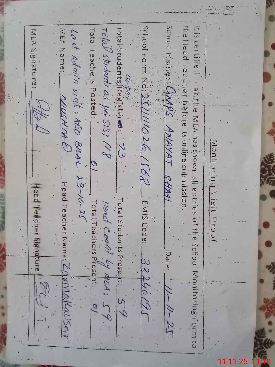 | Attendance Register | Head Teacher | MEA with School | Visit Proof |