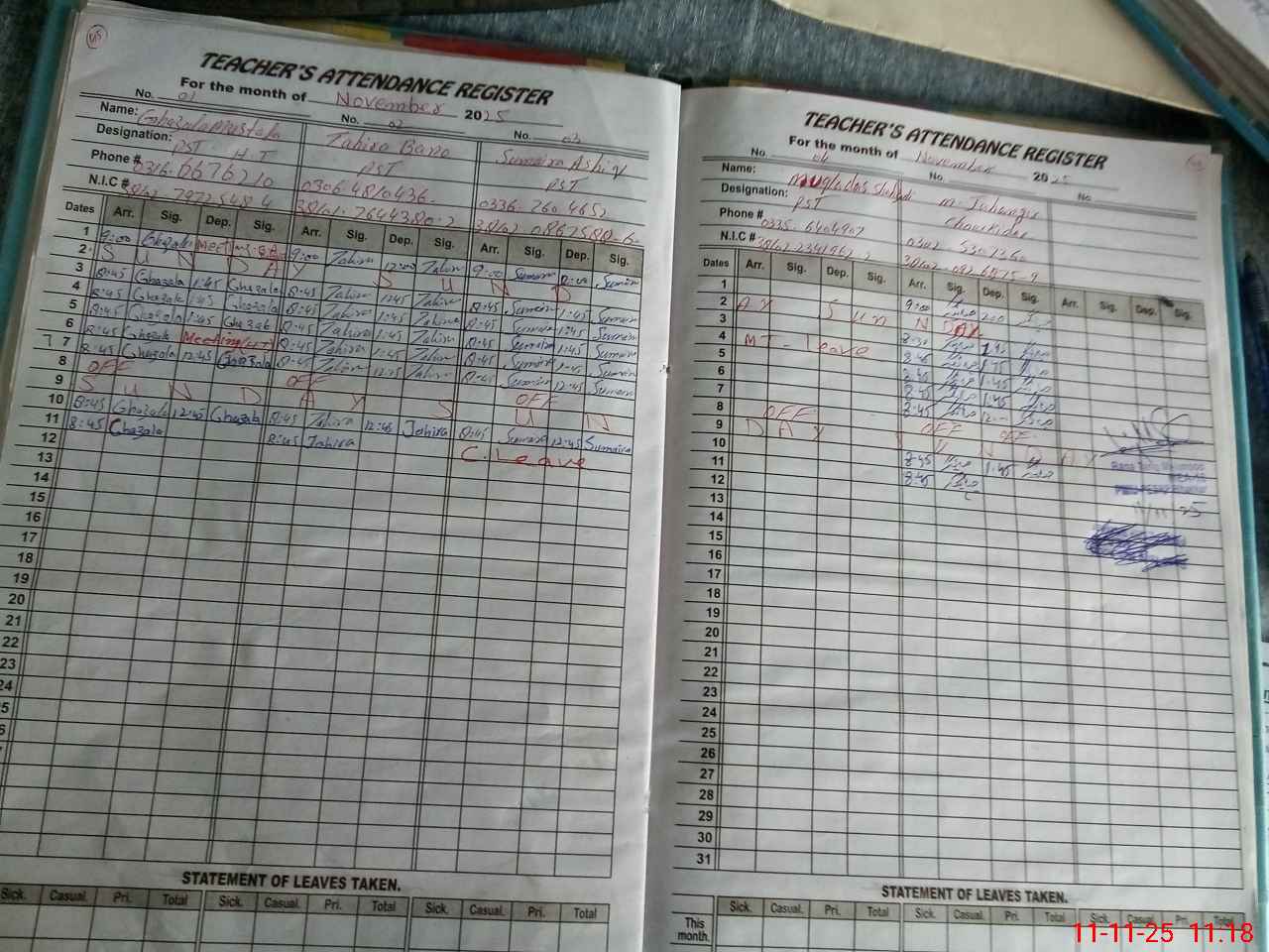| CNIC | Full Name | Designation | R/C | Absence During Last Calender Month |