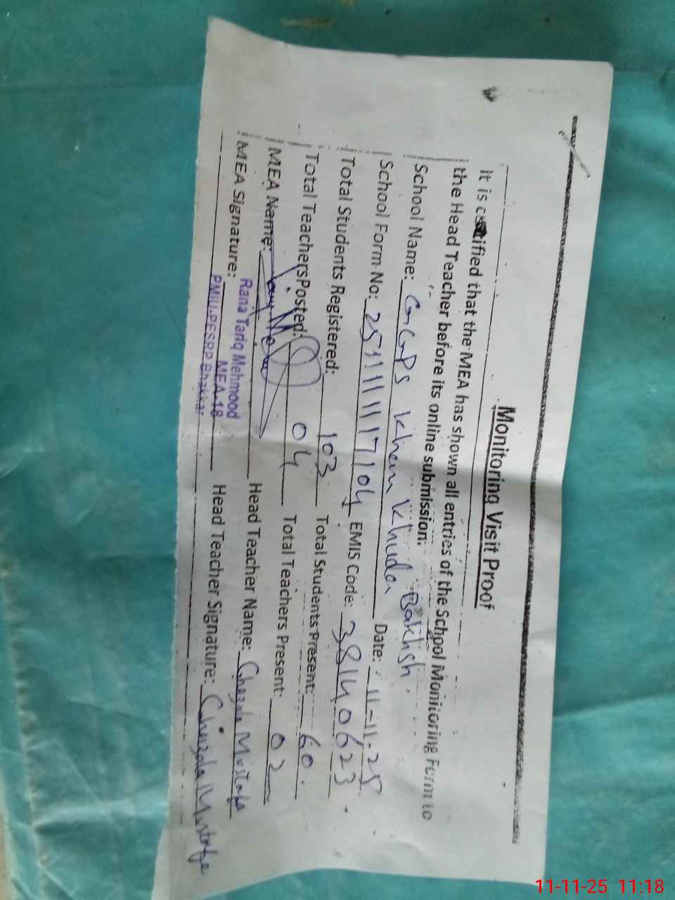 | Attendance Register | Head Teacher | MEA with School | Visit Proof |