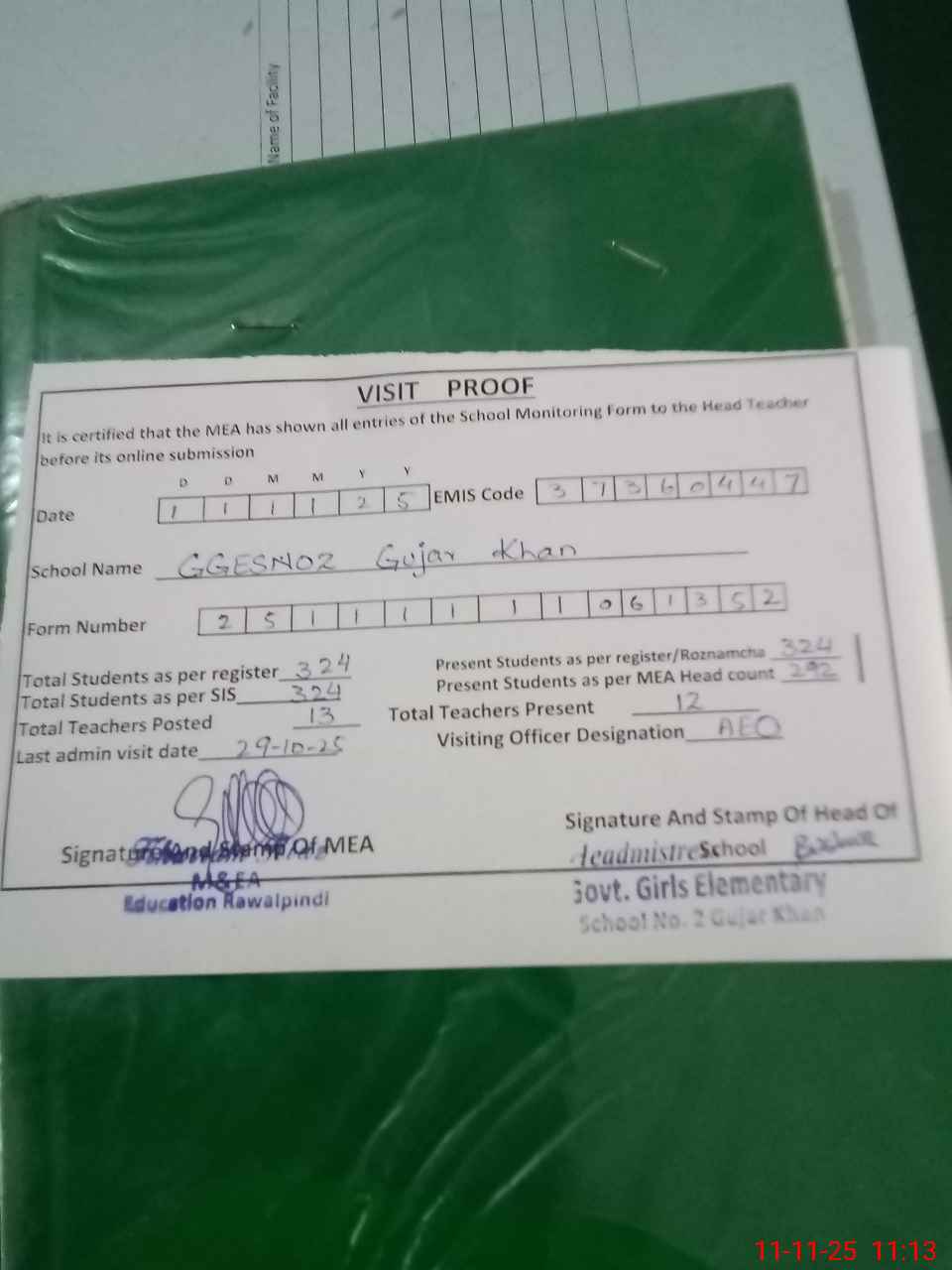 | Attendance Register | Head Teacher | MEA with School | Visit Proof |