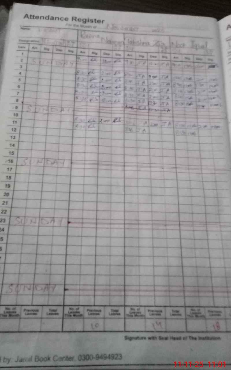 | 35**** | Ar**** Qa**** | Regular | 0 | 0 | 31 | 0 | 0 | 0 | 0 | 0 | 0 | Absent (Un-Authorized) | |