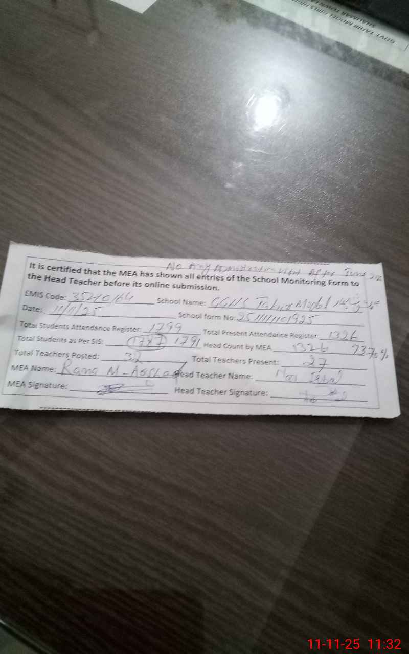 | Remarks (Use Separate Page if Required): Teacher Arooj Qumar EST Long Time Absent as of 1st June 2025 to date SG Afaaq Absent from duty from 23 September to date Students attendance 74 percent Code 35210164 | |||||