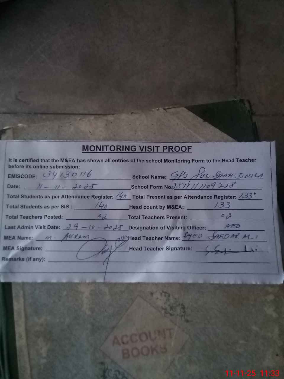 | Attendance Register | Head Teacher | MEA with School | Visit Proof |