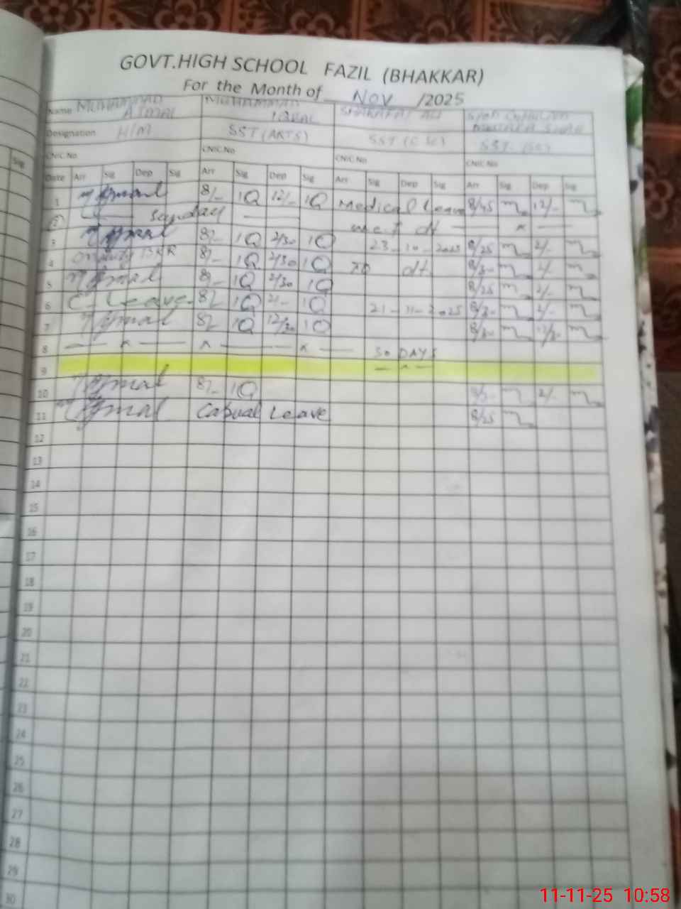 | CNIC | Full Name | Designation | R/C | Absence during last cal. month |