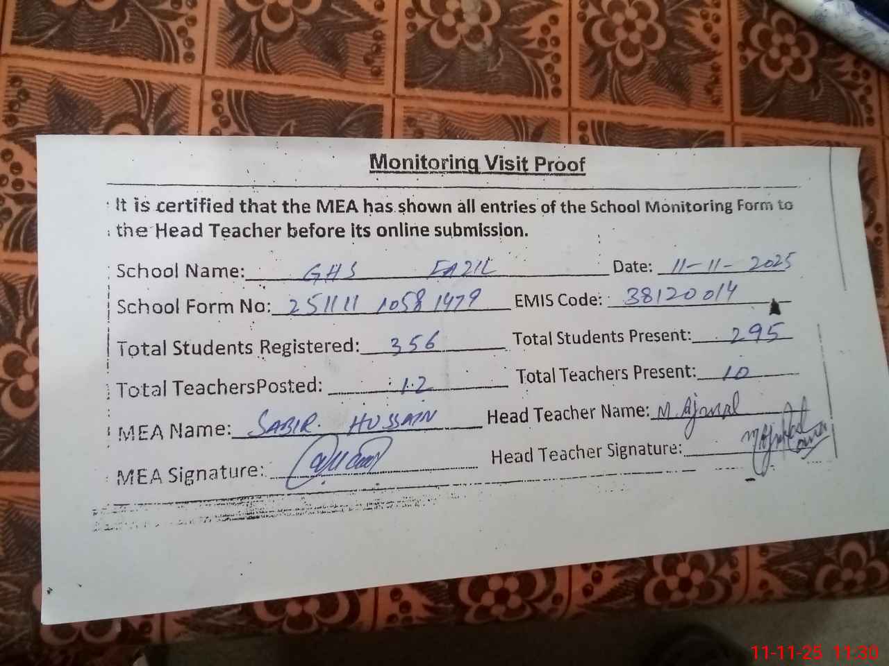 | Attendance Register | Head Teacher | MEA with School | Visit Proof |