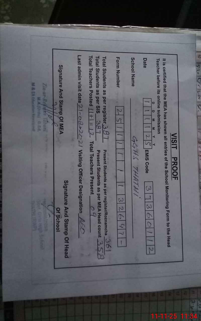 | Attendance Register | Head Teacher | MEA with School | Visit Proof |