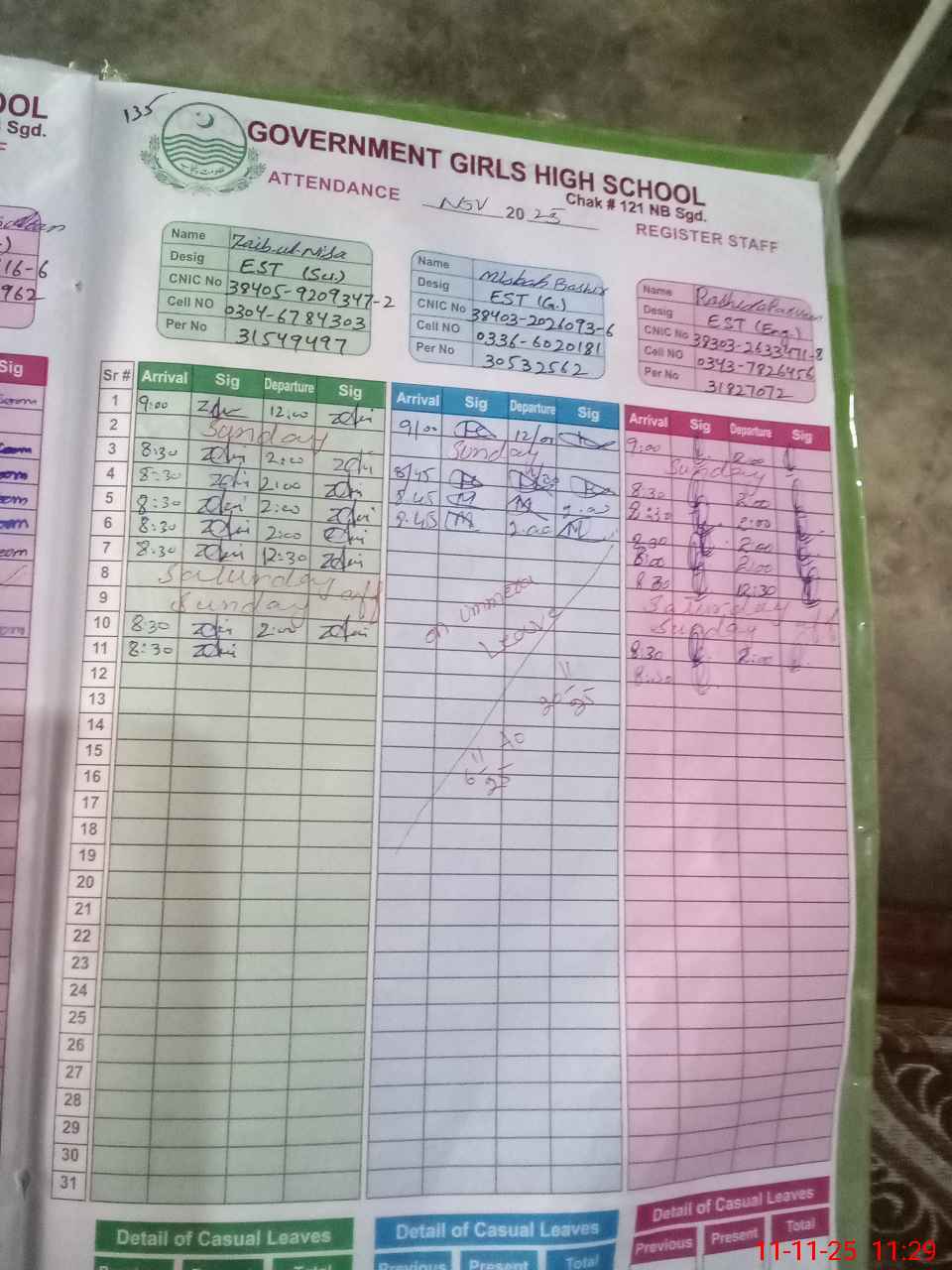 | CNIC | Full Name | Designation | R/C | Absence During Last Calender Month |