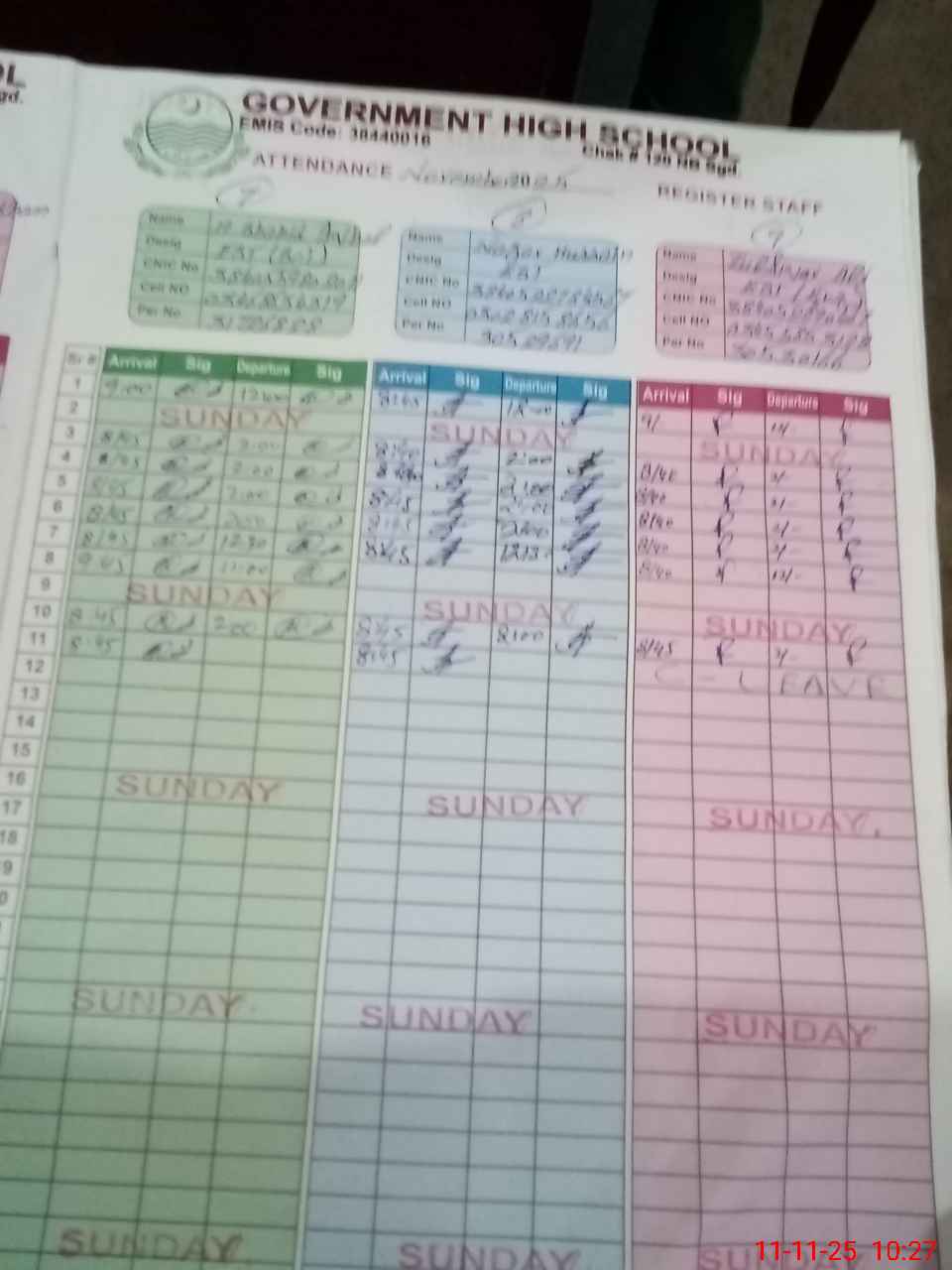 | CNIC | Full Name | Designation | R/C | Absence during last cal. month |