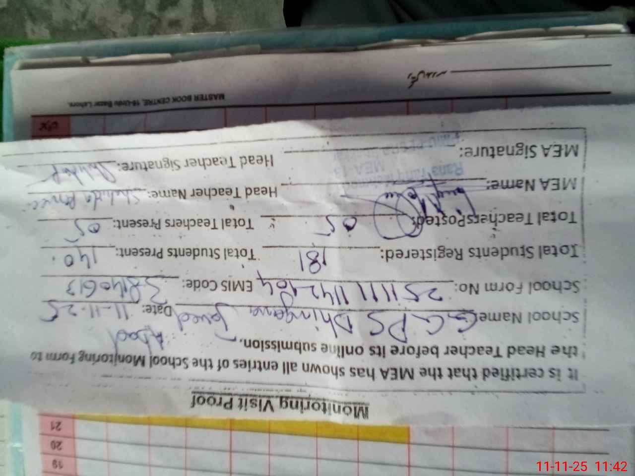 | Attendance Register | Head Teacher | MEA with School | Visit Proof |