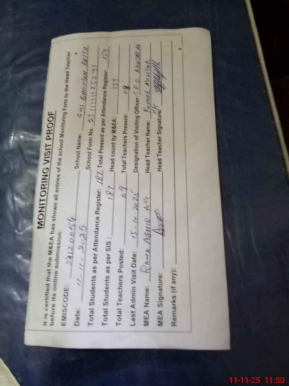 | Attendance Register | Head Teacher | MEA with School | Visit Proof |