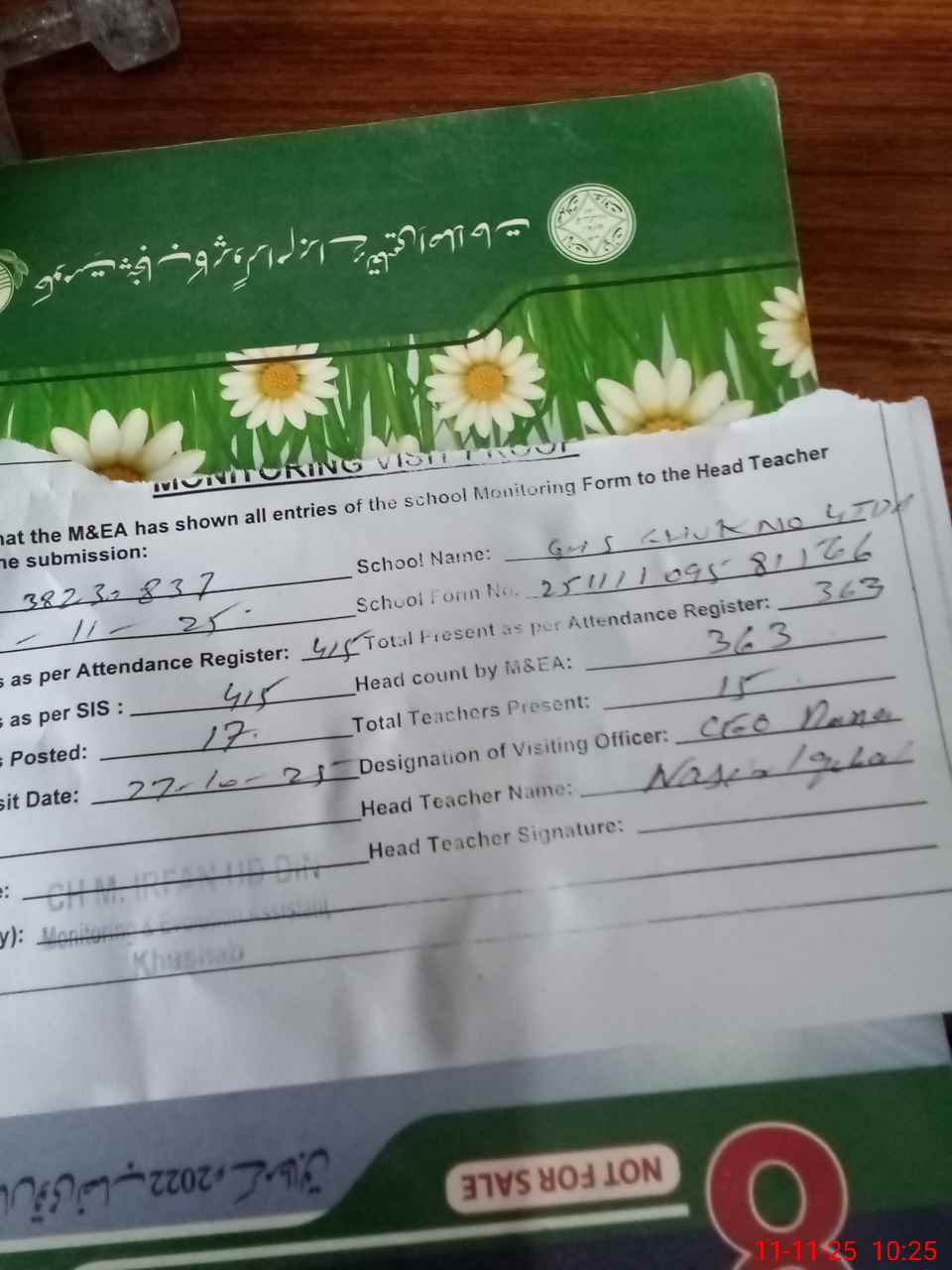 | Remarks (Use Separate Page if Required): Ghs chuk no 4 tda Student on sis 415 Student on register 415 Head count 363 No teacher absent two on leave Last visit CEO Rana 27oct No missing facilities | |||||