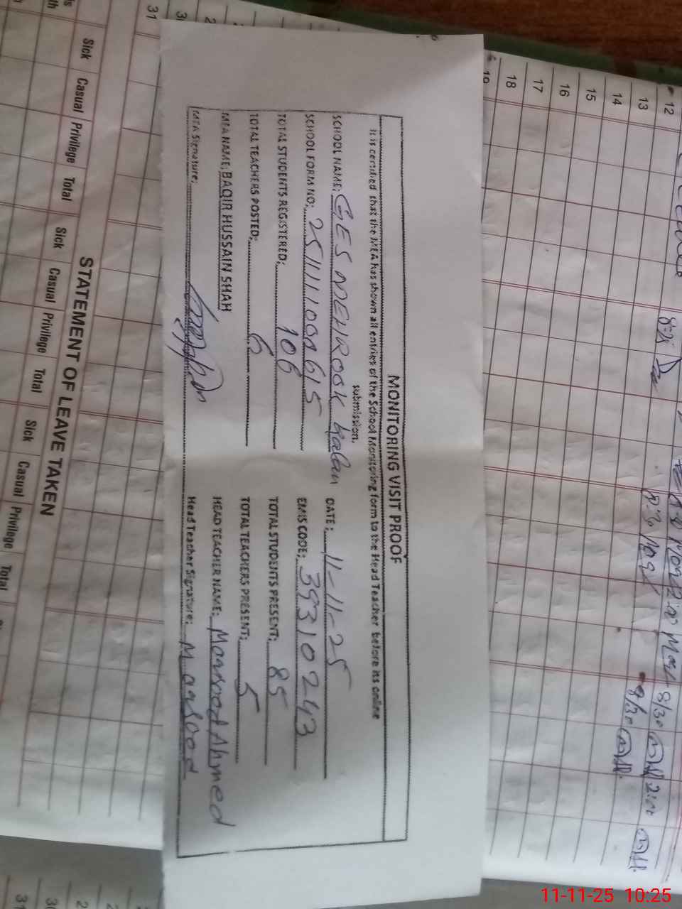 | Attendance Register | Head Teacher | MEA with School | Visit Proof |