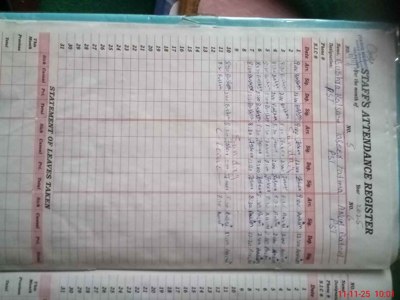 | CNIC | Full Name | Designation | R/C | Absence During Last Calender Month |